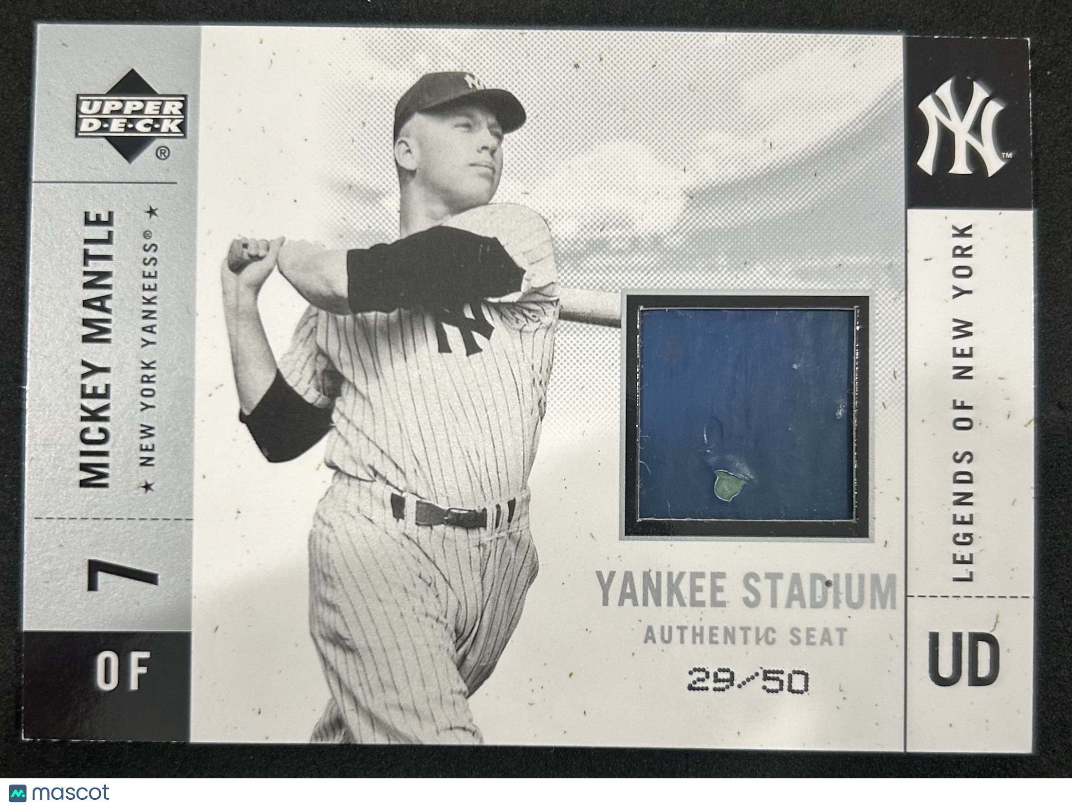 You are purchasing a 2001 Upper Deck Legends of New York Mickey Mantle #YS-MM Authentic Seat Relic 29/50. You will receive the exact item in the photographs. Thank you for looking. Listed With Mascot.