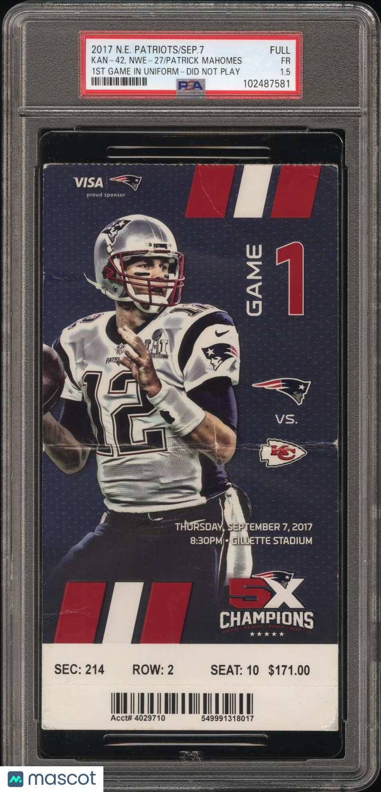 You are purchasing a 2017 N.E. Patriots/Sep.7-Full Did Not Play 1ST Game In Uniform PSA 1.5. You will receive the exact item in the photographs. Thank you for looking. Listed With Mascot.