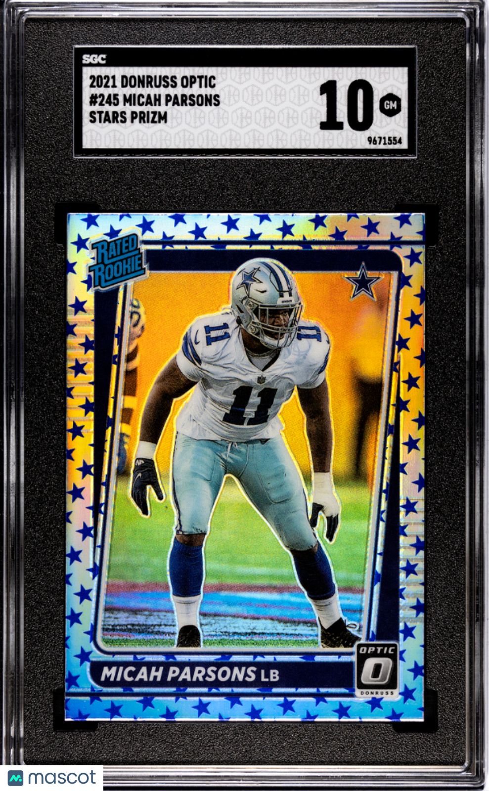 You are purchasing a 2021 Donruss Optic Micah Parsons #245 Stars Prizm SGC 10. You will receive the exact item in the photographs. Thank you for looking. Listed With Mascot.