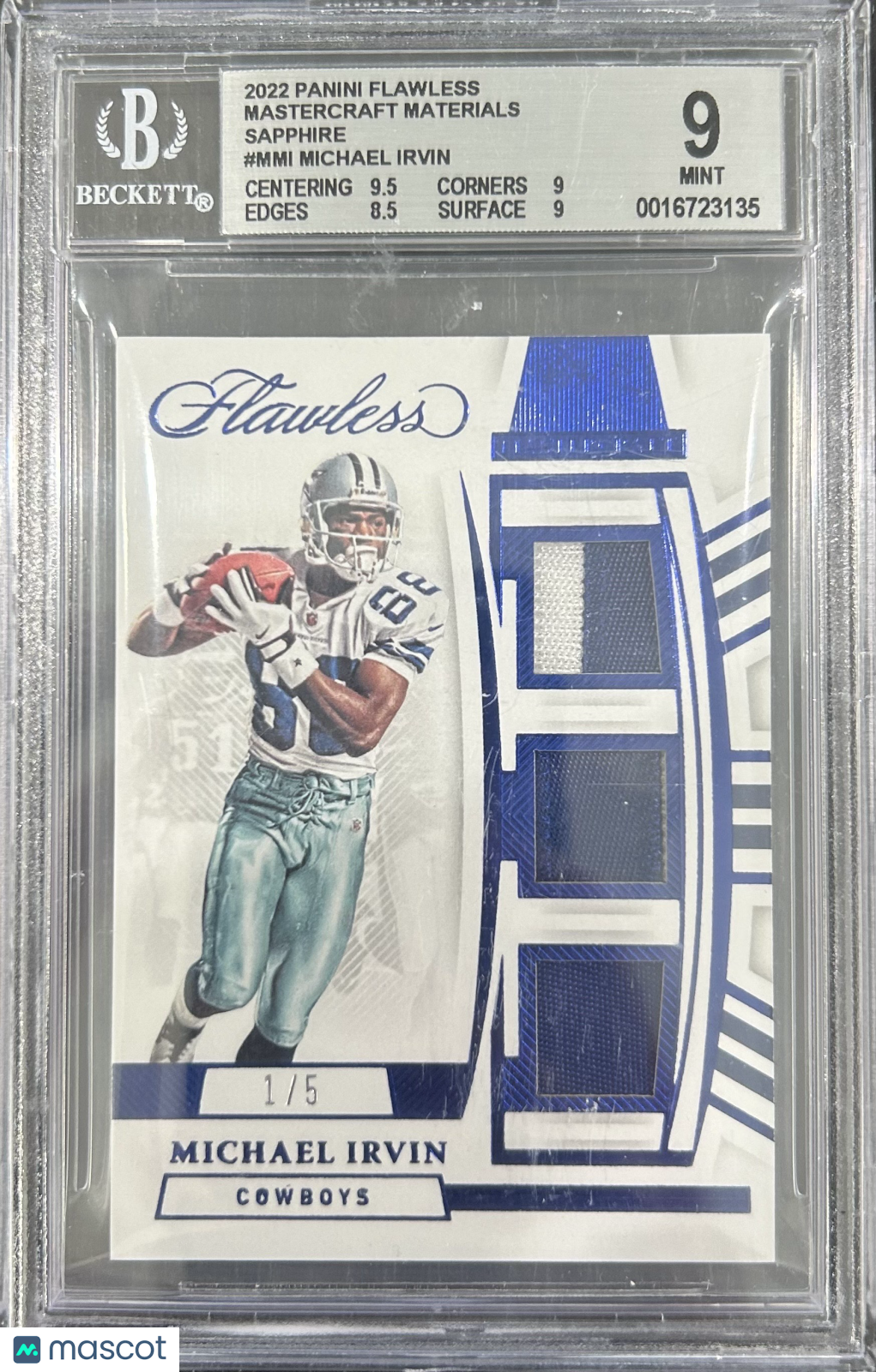 You are purchasing a 2022 Panini Flawless Mastercraft Materials Sapphire Michael Irvin #MMI BGS 9. You will receive the exact item in the photographs. Thank you for looking. Listed With Mascot.