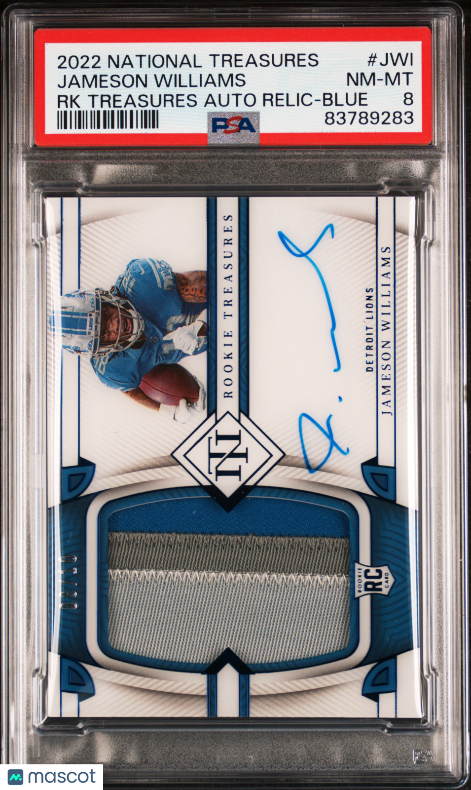 2022 Panini National Treasures Rookie Treasures Autograph Relic Jameson Williams #JWI RK Blue PSA 8
