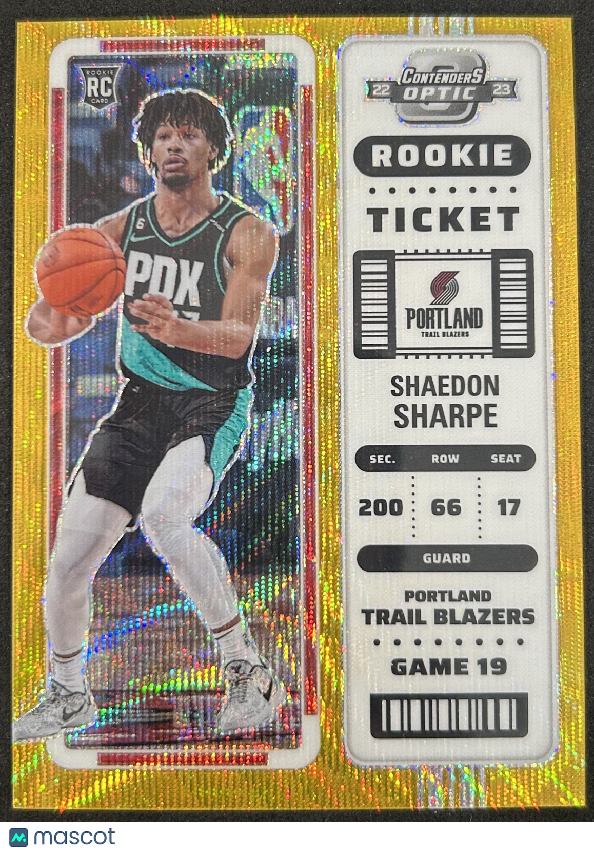 You are purchasing a 2023 2022-23 Panini Contenders Optic Prizm Shaedon Sharpe #17 Gold RC. You will receive the exact item in the photographs. Thank you for looking. Listed With Mascot.