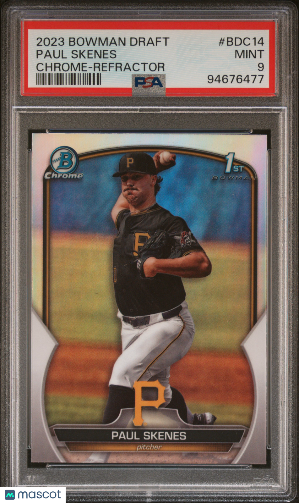 You are purchasing a 2023 Bowman Draft Paul Skenes #BDC14 Chrome Refractor PSA 9. You will receive the exact item in the photographs. Thank you for looking. Listed With Mascot.