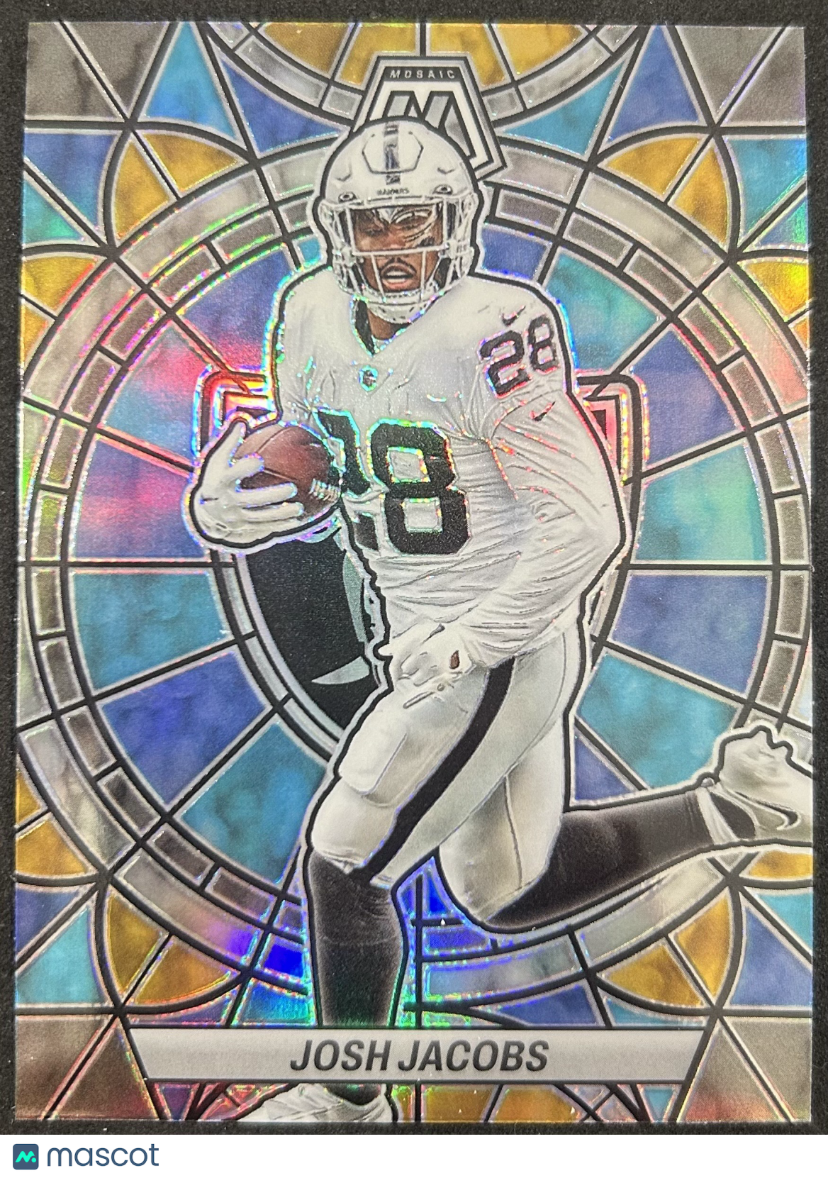You are purchasing a 2023 Panini Mosaic Football Josh Jacobs #SG-12. You will receive the exact item in the photographs. Thank you for looking. Listed With Mascot.