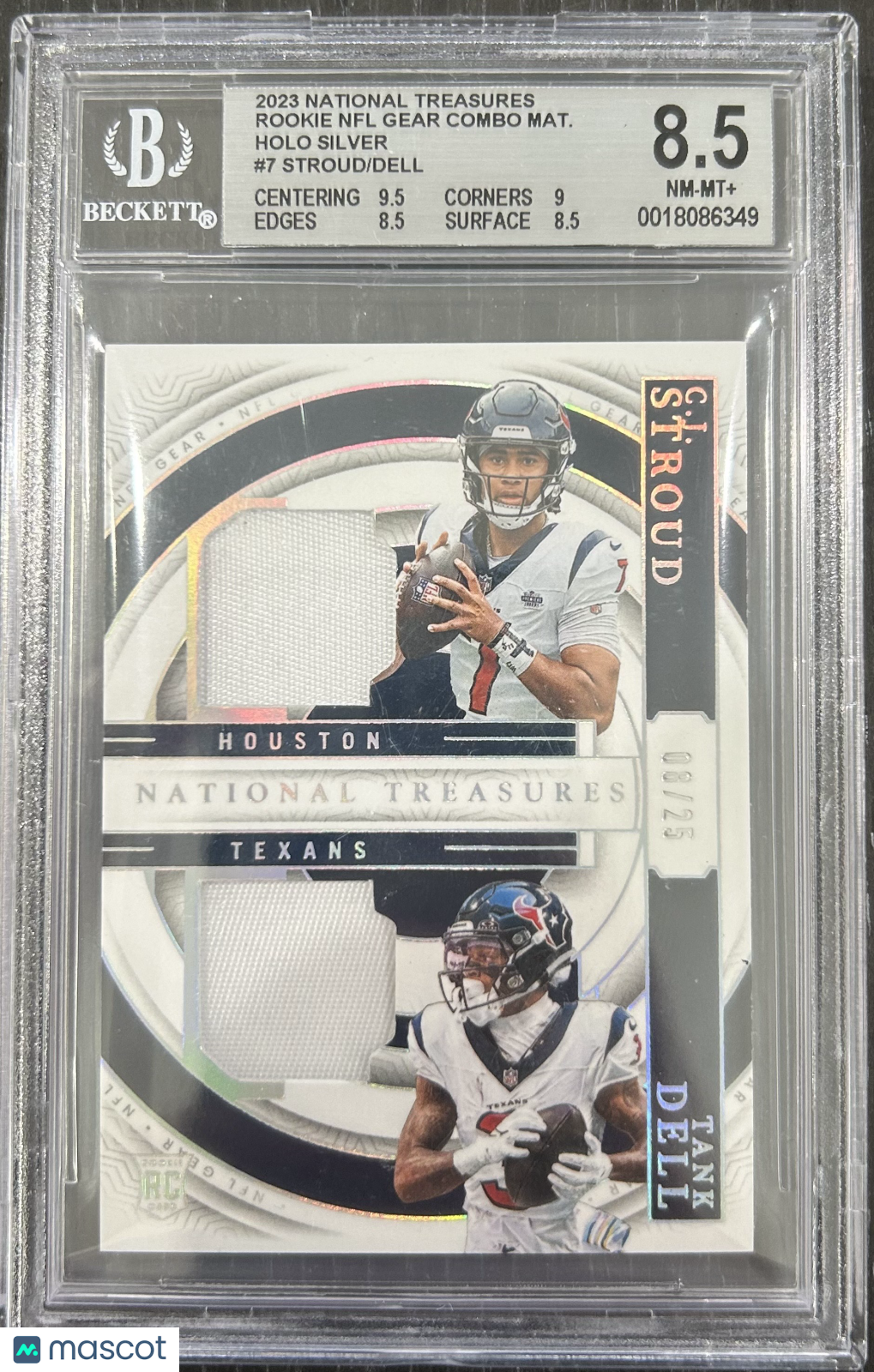 You are purchasing a 2023 Panini National Treasures Rookie NFL Gear Combo Materials Holo Silver Tank Dell CJ Stroud #7 /Tank BGS 8.5. You will receive the exact item in the photographs. Thank you for looking. Listed With Mascot.