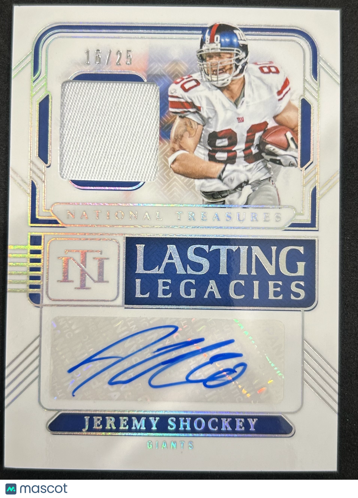You are purchasing a 2025 Panini National Treasures Lasting Legacies Jeremy Shockey #LL-JSY Autograph Jersey Patch 16/25. You will receive the exact item in the photographs. Thank you for looking. Listed With Mascot.