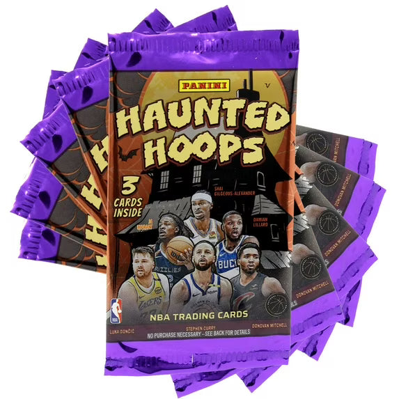 Experience the thrill of the game with the Panini NBA Haunted Hoops Pack. Packed with exclusive cards featuring your favorite NBA stars, this pack offers a chance to uncover rare inserts and key players to elevate your collection. Perfect for passionate basketball fans and collectors seeking excitement and valuable finds in every pack. Don't miss out on adding these unique cards to your lineup.